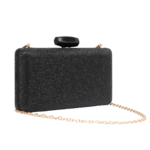 This black glittered silk clutch features a snap closure, a metallic shoulder chain, and a single open compartment. It can be used to carry essentials for dinners, events, or formal gatherings.