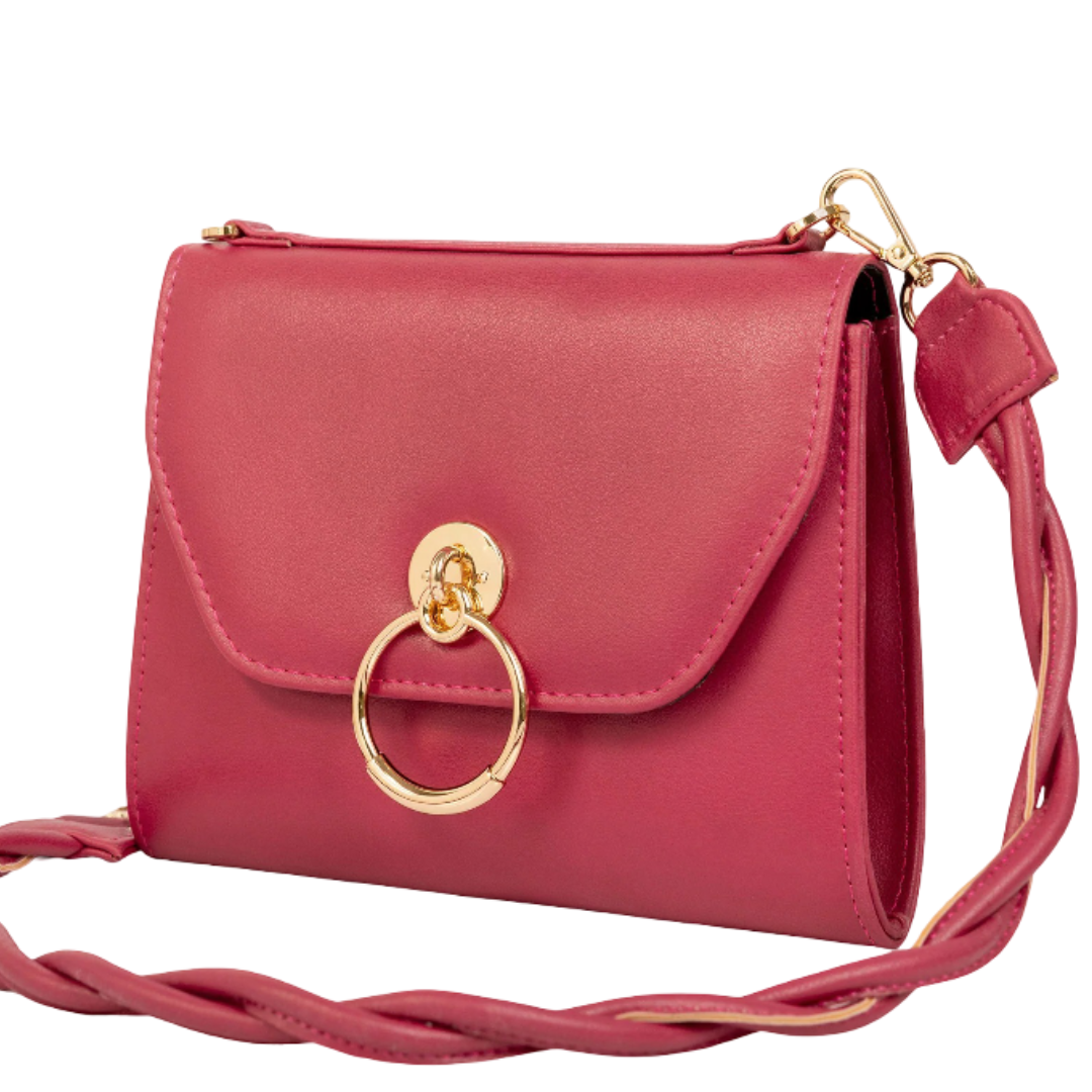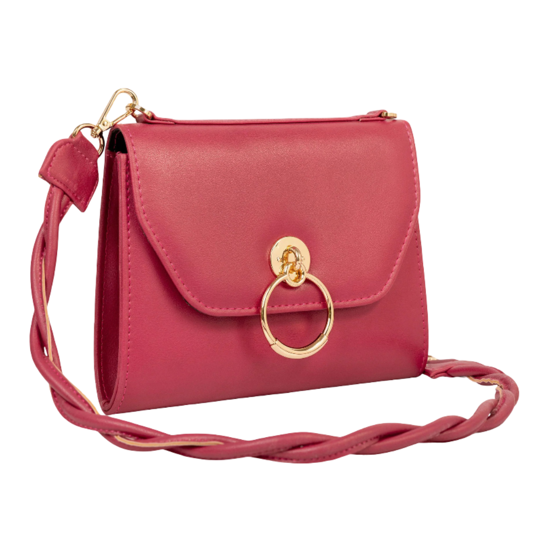 A medium-sized casual clutch by Tommie Riley in soft pink rexine. It features a beige ring detail, magnetic fastener lock, and a braided shoulder strap. Designed with one main compartment and a small zipped pocket inside — ideal for carrying everyday essentials with ease.