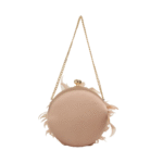 Made from mink brown satin, this medium-sized clutch features feather embellishments, a synthetic monogrammed lining, and a gold chain strap for shoulder or handheld use. It can be used for weddings, dinners, or special occasions.